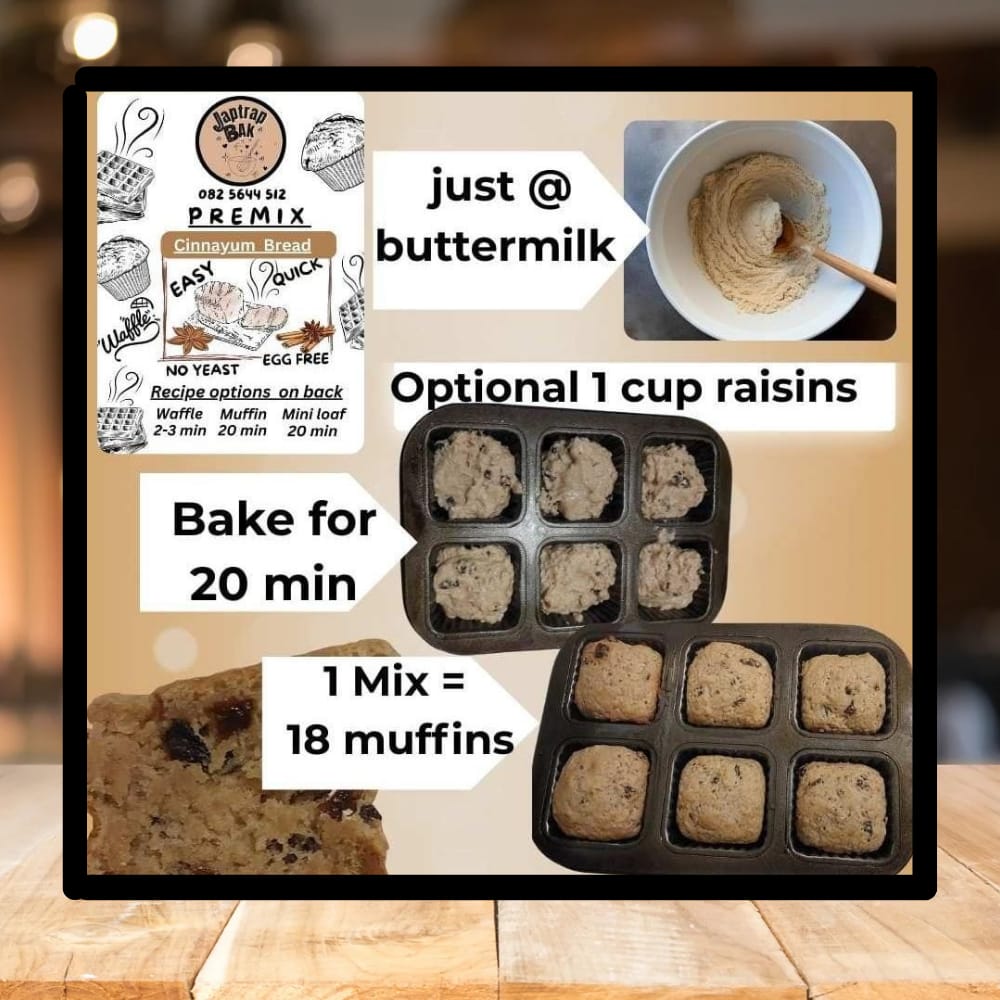 Enjoy the warm, comforting flavor of cinnamon with Japtrap Bak’s Cinnayum Bread Premix. This easy-to-use mix allows you to create delicious cinnamon-flavored bread, muffins, or mini loaves, with or without raisins. Just add buttermilk (or amasi) to the premix and enjoy this versatile treat. Perfect for breakfast, brunch, or a sweet snack, this premix delivers consistent, high-quality results every time.